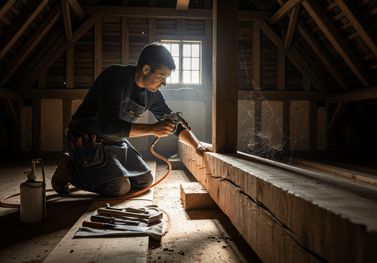 Sciure au sol, petits trous, bois friable, bruits de grignotement : traitement préventif/curatif (injection ou pulvérisation) tous les ~10 ans.